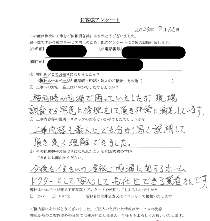 屋根の雨漏り修理でご依頼をいただいたお客さまの声です。