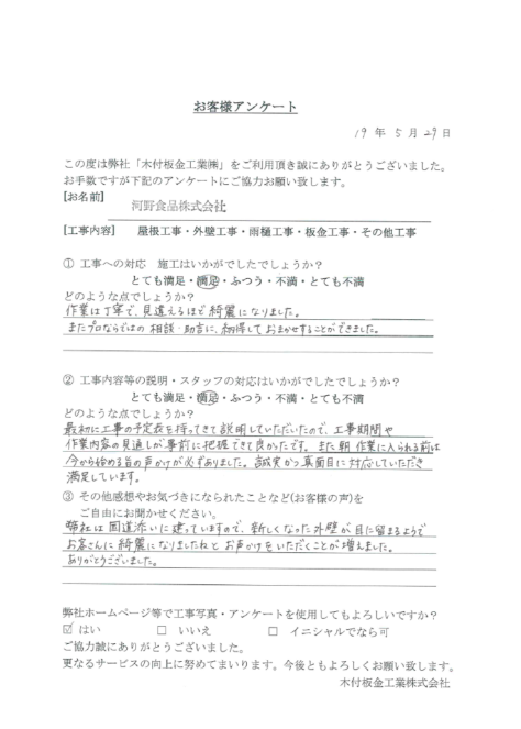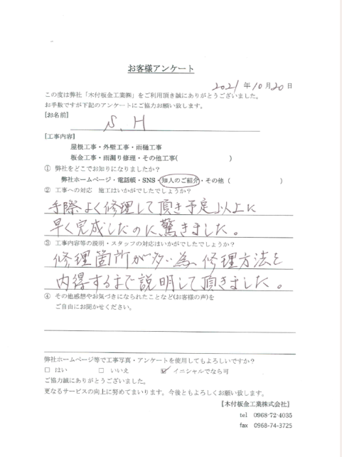 現場調査から早急に修理に取り掛かったことに非常に満足されており、工事内容もわかりやすく説明していただいたとのお声をいただきました。